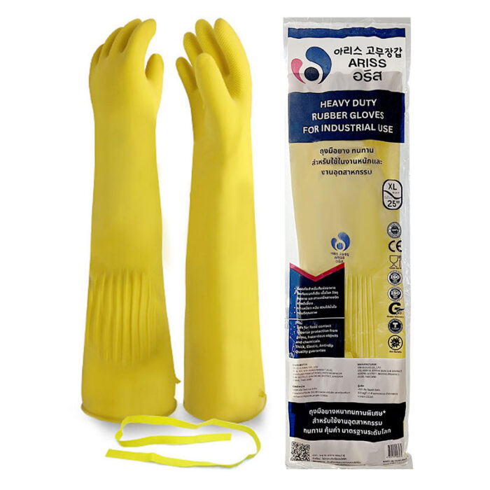 Extra-thick yellow natural rubber gloves (40 mil.) resistant to moderate acids and alkalis. Embossed palm and fingertips for better grip. Certified Food Safety for multipurpose use.